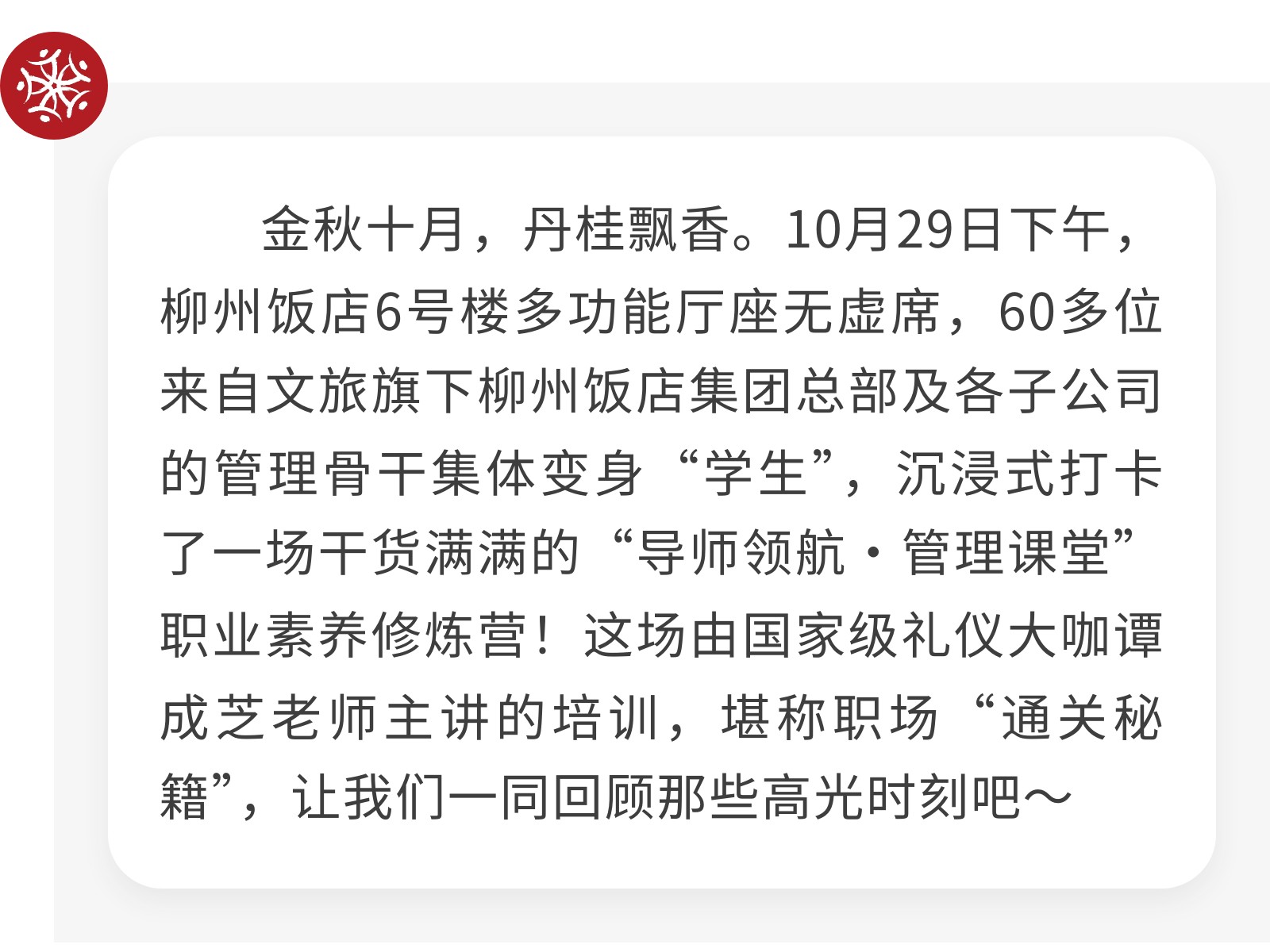 柳州飯店集團(tuán)“導(dǎo)師領(lǐng)航·管理課堂”職業(yè)素養(yǎng)修煉營(yíng)圓滿舉辦 發(fā)布時(shí)間:2025年10月31日 10時(shí)來(lái)源:本站原創(chuàng)瀏覽:157 人次