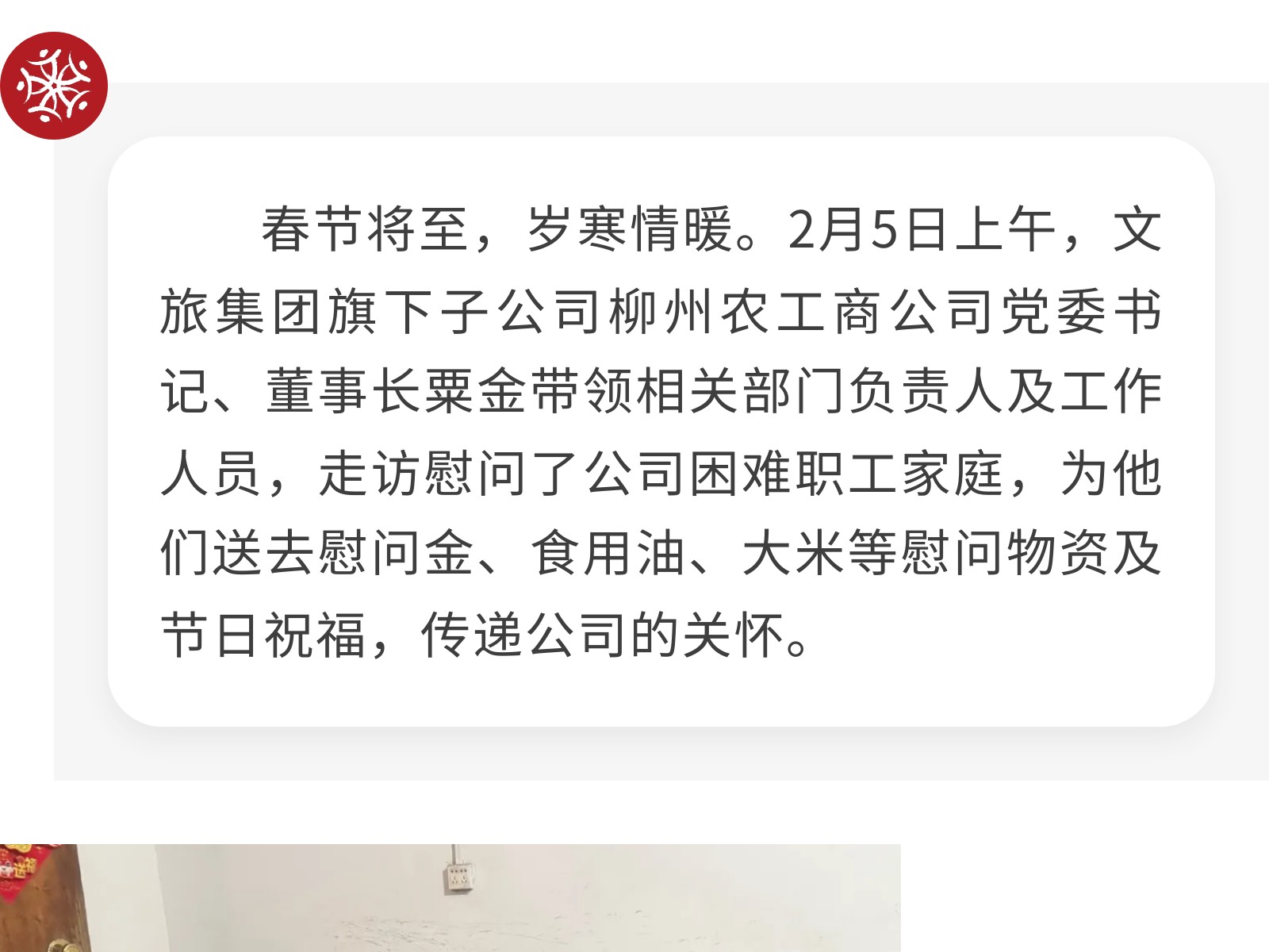 關(guān)懷暖寒冬 真情潤(rùn)心田——柳州農(nóng)工商公司工會(huì)組織開(kāi)展困難職工走訪慰問(wèn)活動(dòng) 發(fā)布時(shí)間:2026年02月06日 12時(shí)來(lái)源:本站原創(chuàng)瀏覽:48 人次