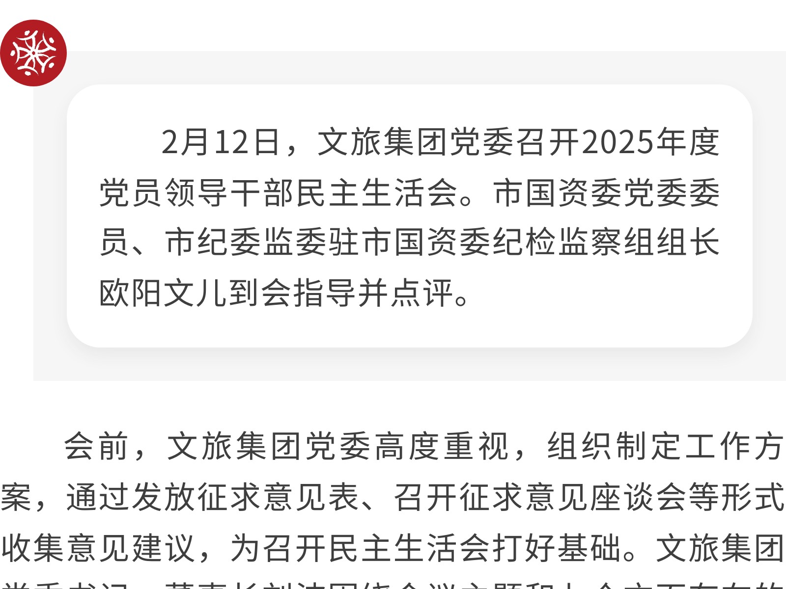【黨建引領(lǐng)】文旅集團(tuán)黨委召開(kāi)2025年度黨員領(lǐng)導(dǎo)干部民主生活會(huì) 發(fā)布時(shí)間:2026年02月12日 13時(shí)來(lái)源:本站原創(chuàng)瀏覽:50 人次