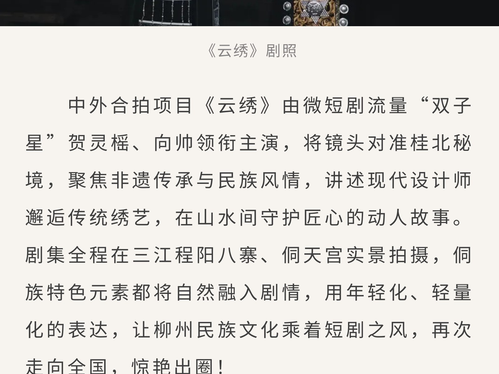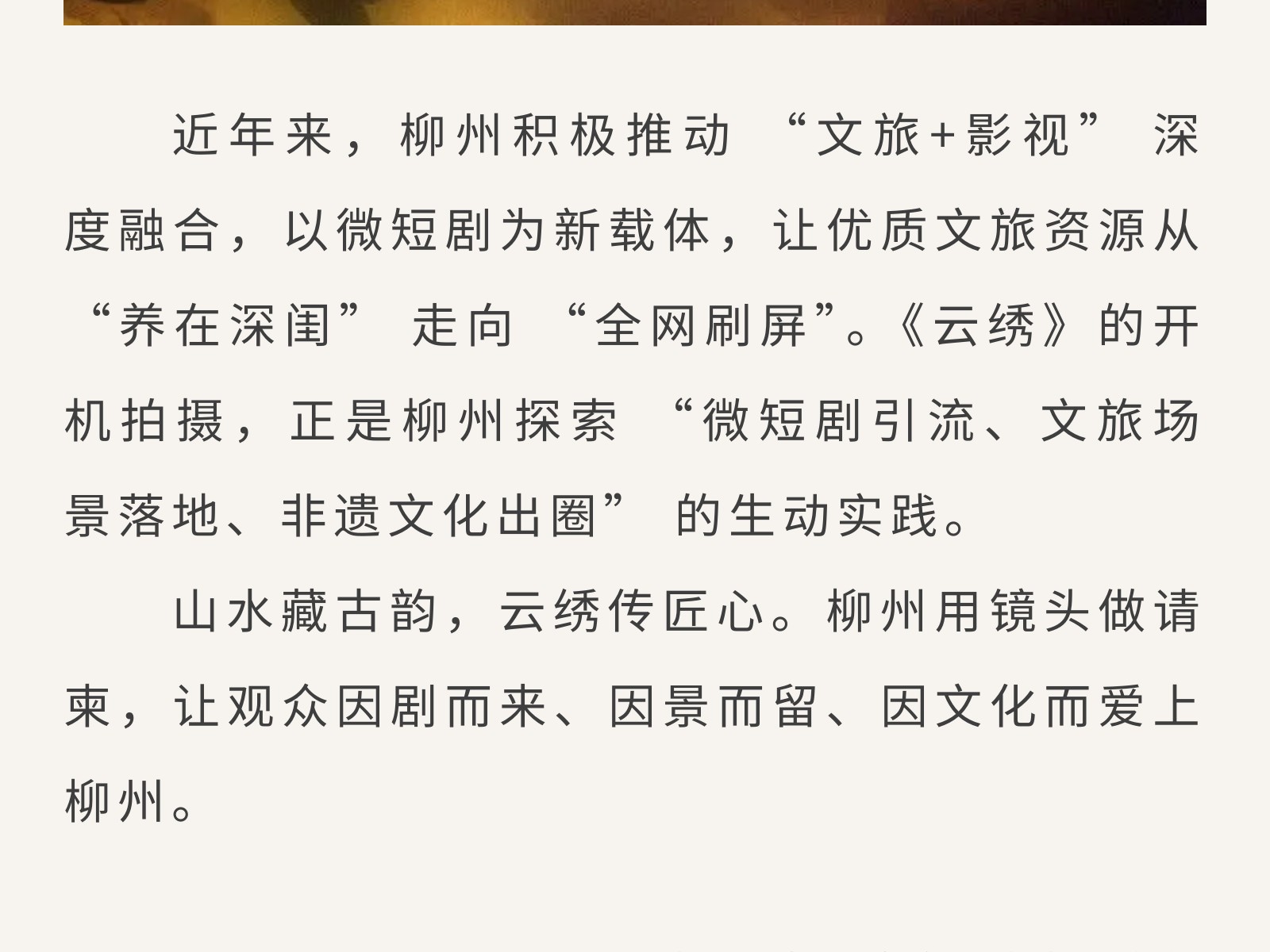 廣西“微短劇+文旅” 重點扶持項目《云繡》開機,把非遺風情拍入鏡頭里 發(fā)布時間:2026年03月06日 10時來源:本站原創(chuàng)瀏覽:52 人次