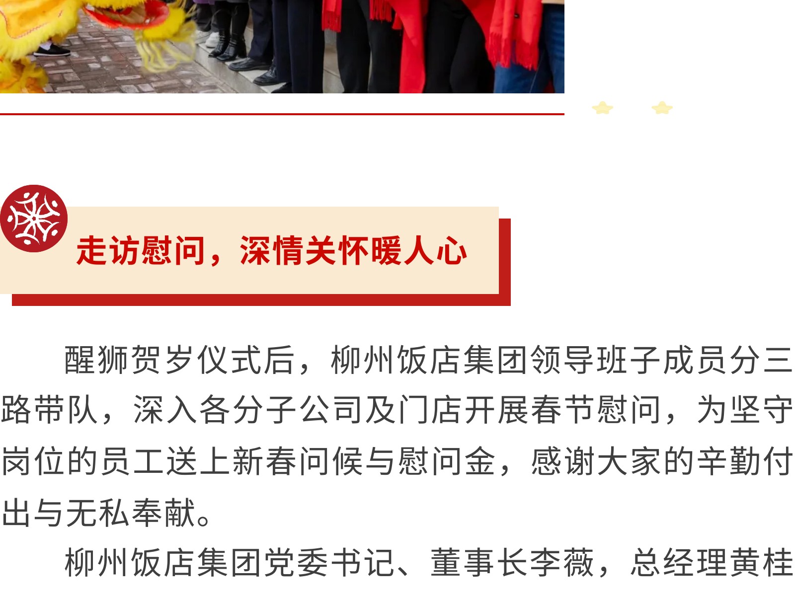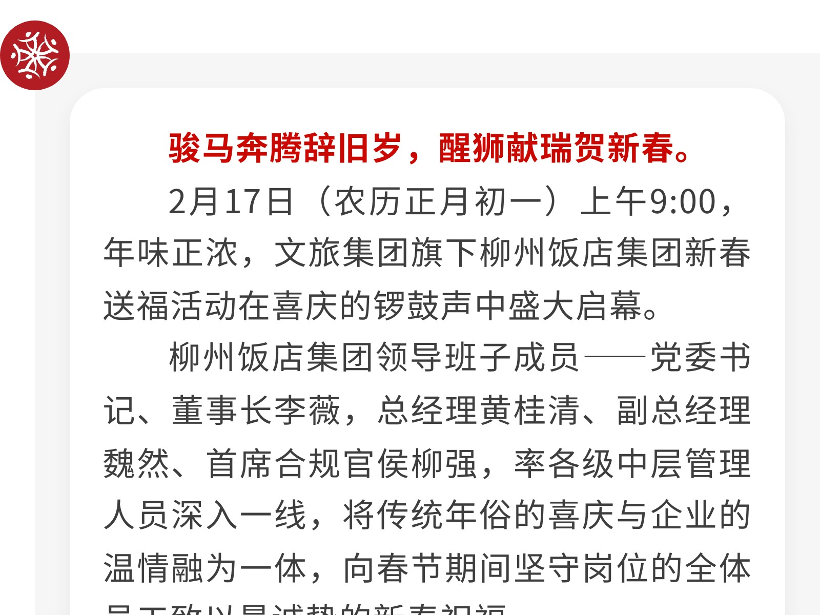 龍騰獅躍賀新春,情暖一線送福至——柳州飯店集團(tuán)開展2026年新春送福慰問活動 發(fā)布時(shí)間:2026年02月24日 13時(shí)來源:本站原創(chuàng)瀏覽:68 人次